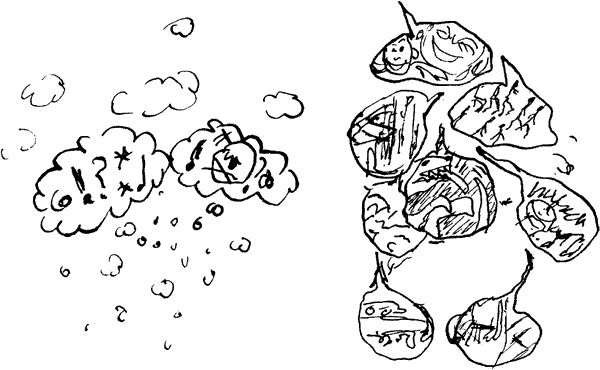 Not all of the cells in the monster are sleeping so soundly, there are even a few that wake up once in a while. There aren't very many of them and mostly they know nothing of each other's existence since they all live spread out across the body. But living with open eyes is so painful because then you see all the horror the sleep is doing with the other cells. The monster must wake up. But how do you make that happen? First you explain what all the benefits are. He hears nothing. Then you make an alarm clock go off in an echoing well. He just rolls over and goes on snoring. You stick a sword in the monster's big fat body while you scream in his ear. He flattens you like a fly. You let him crucify you while you go on loving him. Now he dreams sweeter dreams, prayer and meditation bring him peace and quiet and he sleeps much better. The coma is holy. The coma lives forever. The coma reincarnates from one cell into the next. So kneel and worship, and don't disturb the peace and quiet or else the coma will send in a squadron of cancer troopers.