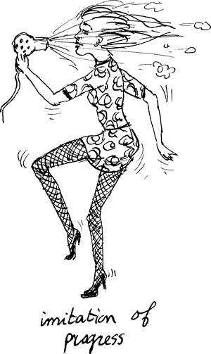In every street there's at least one housewife who daydreams of fixing a rope to the ceiling so she can surprise her husband when he comes home after a hard day's work. How was your day at the office, she doesn't ask. Same as usual, he doesn't answer. No kiss kiss. In the oven there's a TV dinner spreading a stench of cremation. But her purple swollen tongue won't be eating tonight. His soundless scream doesn't wake her up. Unfaithful bitch, he hisses under his breath, don't you remember we promised we would always stay unicellular, we wouldn't have sex and we would never die, we would reproduce by dividing so we'd both have a clone as soon as we figured out how, and didn't we also solemnly agree not to eat any meals all manufactured in advance by the supermarket? He grabs the TV dinner and dumps it into the garbage can. Did she have anything to eat, the police ask him later on. He categorically denies. And what about this TV dinner here, they bark, what's that supposed to mean? They hold his face above the open garbage can. Beef stroganoff, moo goo gai pan and turtle soup, he sighs, the dessert must still be in the fridge... The police drag him off to the dining room. Lies, nothing but lies, they growl and then they put on some moody music, set the table with white paper tablecloth and plastic champagne glasses, light the candles and serve dinner. And in the weekends a long romantic walk on the beach and a good glass of wine, they order. Everyone has already forgotten her except the stench and the maggots... The sound of a car door slamming shut in the driveway wakes her out of her daydream, her husband walks in and she stands up for a kiss. Kiss my wounds, kiss my strangled neck and my purple face, the doctor says he'll have to amputate my soul, it's the only way he can save me, do you still love me?